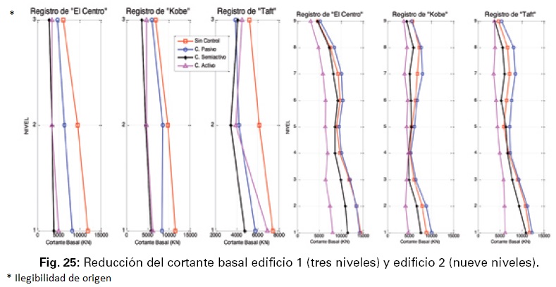 En la Fig. 25 se aprecia la reducción del cortante basal en ambas estructuras. El sistema semiactivo tiene un buen desempeño respecto a los demás sistemas de control en el edificio 1. Mientras que en el caso del edificio 2, se observa que el sistema activo tiene una mejor reducción del cortante basal que sus similares pasivo y semiactivo. De hecho, el sistema pasivo no contribuye en la reducción de las respuestas.