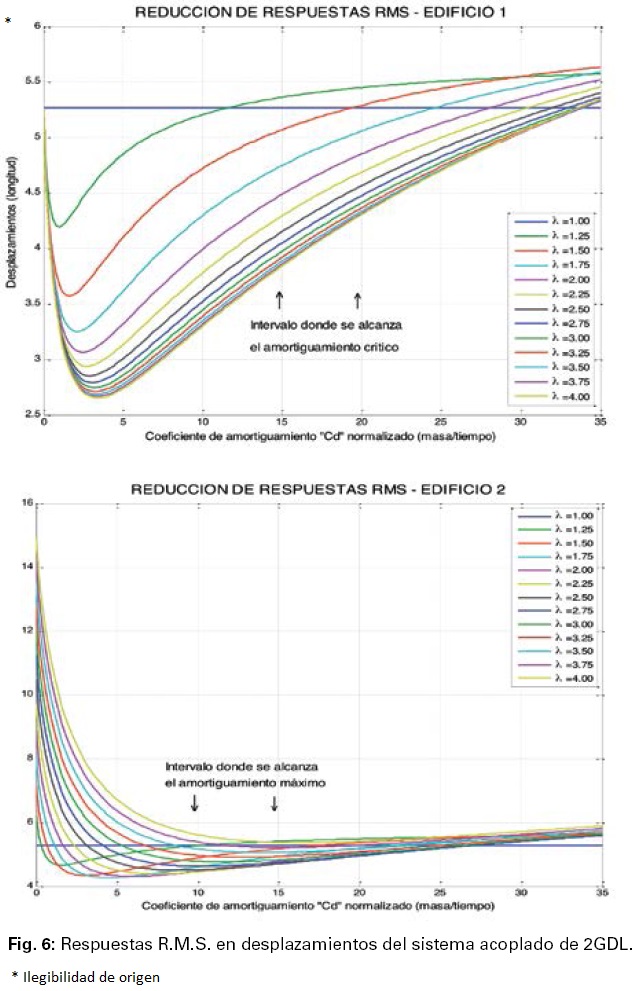 De la Fig. 6 se puede concluir que: cuando el coeficiente de amortiguamiento cd se incrementa (más rígido), los desplazamientos en ambos edificios se reducen hasta cierto punto óptimo. A partir de este valor el incremento del coeficiente aumenta los desplazamientos en ambos edificios. También, se aprecia que a medida que los valores del coeficiente λ disminuyen, la capacidad de control se reduce, hasta quedar nula (cuando ω1= ω2). Esto muestra que si los edificios son iguales, el acoplar edificios no es muy eficaz.