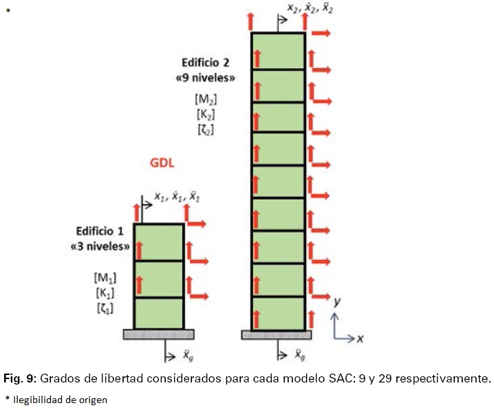 Se creó un modelo matemático de por medio de representación de estados de las estructuras acopladas (ec. 13). Los grados de libertad considerados en cada modelo se muestran en la Fig. 9.