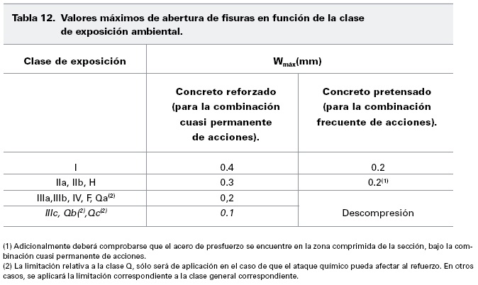 La durabilidad es, junto a consideraciones funcionales y de aspecto, uno de los criterios en los que se basa la necesidad de limitar la abertura de fisura. Los valores máximos a considerar, en función de la clase de exposición ambiental, serán los indicados en la siguiente tabla.