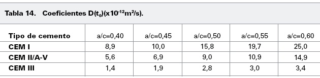 Para la utilización del modelo de penetración de cloruros puede emplearse el valor de D(t0) obtenido mediante ensayos específicos de difusión (en cuyo caso t0 sería la edad del concreto a la que se ha realizado el ensayo), o bien emplear los valores de la siguiente tabla (obtenidos para t0 = 0,0767)