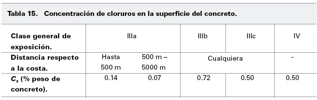 El valor de Cs depende de las condiciones externas, especialmente de la orografía del terreno y del régimen de vientos predominantes en la zona, en el caso de ambientes próximos a la costa. Además, Cs varía con la edad del concreto, alcanzando su valor máximo a los 10 años. A falta de valores obtenidos a partir de ensayos en estructuras de concreto situadas en las proximidades, el Responsable del proyecto valorará la posibilidad de adoptar un valor de Cs de acuerdo con la tabla siguiente, en función de la clase general de exposición.