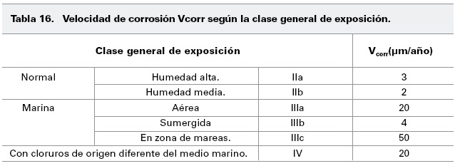 A falta de datos experimentales específicos para el concreto y las condiciones ambientales concretas de la obra, la velocidad de corrosión podrá obtenerse de la siguiente tabla.