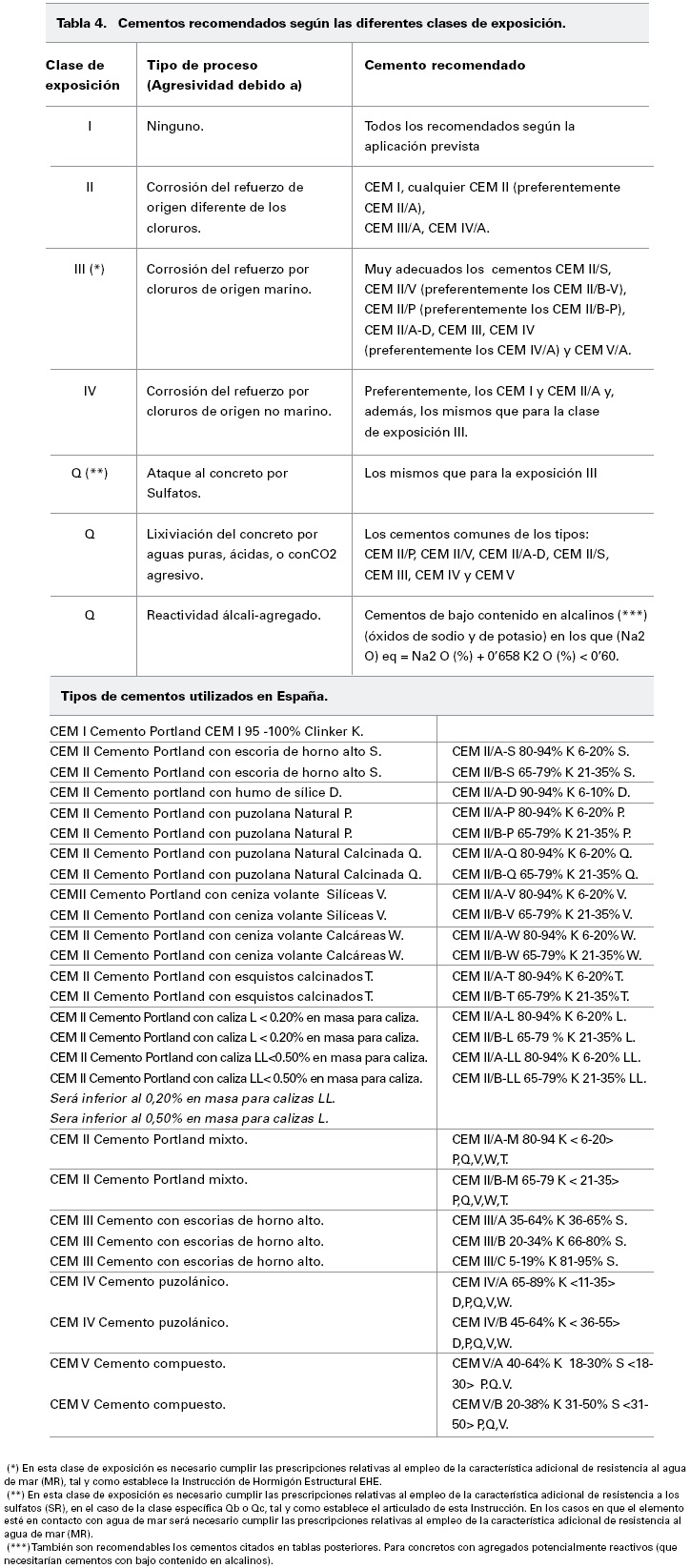 Es importante para la durabilidad la selección del tipo de cemento más adecuado según las recomendaciones de la instrucción para la Recepción de Cementos (RC-08)4.