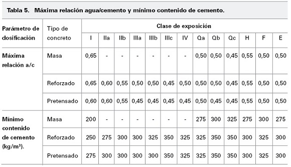 Las especificaciones de relación agua/cemento y de contenido de cemento son las que determinan la dosificación pero a la vez condicionan unas determinadas características mecánicas del concreto. Los valores de las resistencias de la tabla, a título meramente indicativo, son las que resultan coherentes con las respectivas dosificaciones.