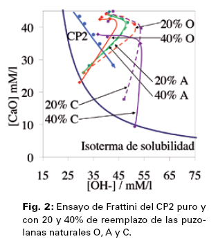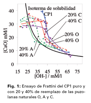 Puzolanicidad: En las Figuras 1 y 2 se muestran los resultados del ensayo de Frattini desde los 20 minutos hasta el primer día de hidratación del CP1 y del CP2 solos y con las tres puzolanas naturales O, A y C, respectivamente. En el caso de las muestras con el CP1 desde los 20 minutos se puede apreciar claramente el efecto de dilución con respecto a la [OH]. En parte, debida a la disminución de los constituyentes del cemento portland que liberan hidróxido de calcio al medio; sin embargo, con el avance de las reacciones de hidratación dicho efecto comienza a solaparse con el de estimulación llegando a la edad de 1 día a valores comparables a los del patrón. Con el CP2, en cambio, el efecto que se manifiesta desde los 20 minutos es el de estimulación resultando la [OH-] de las muestras con las puzolanas naturales O, A y C superior a la del patrón; sin embargo, con este cemento portland se manifiesta claramente la reactividad de las puzolanas naturales para fijar hidróxido de calcio por medio de la reacción puzolánica a la edad de 1 día, cuando todas las mezclas se acercan a la isoterma de solubilidad con la "intención" de cruzar la misma hacia la zona de subsaturación (puzolanicidad positiva); hecho este último que llega a concretarse con las muestras con 40% de reemplazo por las puzolanas A y C.