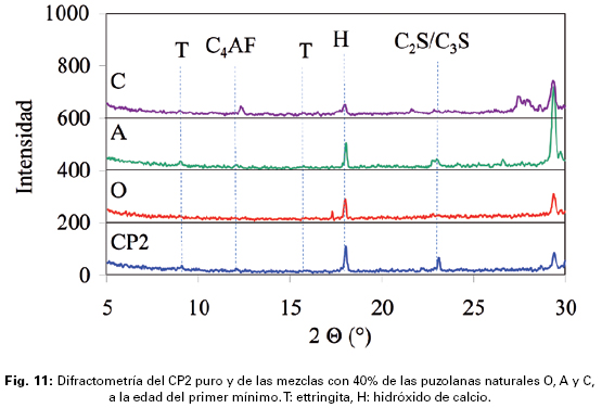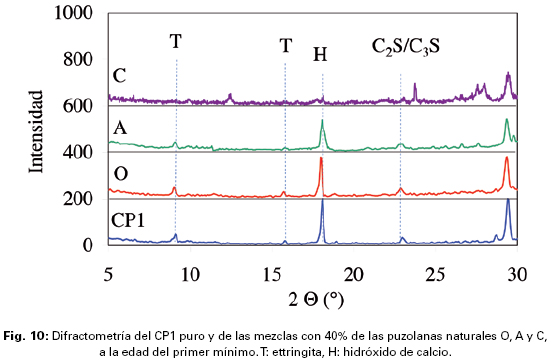 Con la puzolana A, las demandas de agua se incrementaron y más con el incremento del porcentaje de reemplazo, para ambos cementos, pero sobre todo para el CP1, esto pudo deberse, en parte, a la elevada adsorción que presentó, y también, en parte, a la mayor proporción de alúmina reactiva que de sílice reactiva de esta adición (compa- g rada con la puzolana O), puesto que la fase alumínica para su hidratación requiere de mayor cantidad de agua para formar sus compuestos de hidratación (Tabla 2). Así, mientras que los tiempos de fraguado aumentaron con el incremento del porcentaje de reemplazo en las muestras con el CP1, principalmente por su mayor demanda de agua; en las muestras con el CP2 disminuyeron, debido posiblemente a la formación de productos de reacción provenientes de la alúmina reactiva de origen puzolánico (Rahhal, V., Talero, R., 2010).