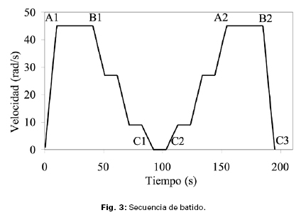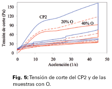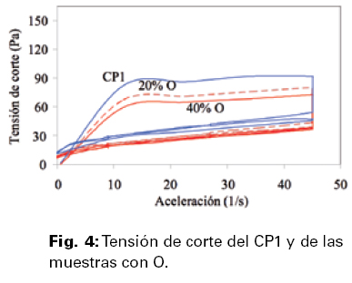 El diseño de la secuencia de batido, (Fig. 3), fue producto de un estudio previo (Rahhal, V. et al; 2010), en el que se privilegió la mayor diferencia entre las ramas de aceleración y desaceleración. En las Figuras 4, 6 y 8 se representan las tensiones de corte de las muestras del CP1 con las puzolanas O, A y C, respectivamente; y en las Figuras 5, 7 y 9 las de las muestras con el CP2 y la misma secuencia de puzolanas.