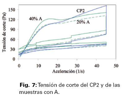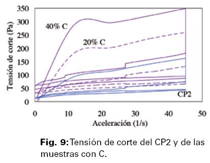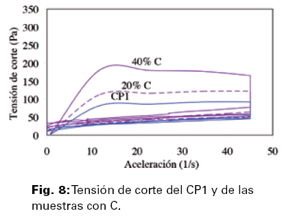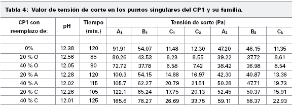 Comparando las muestras con 20% de reemplazo tanto con el CP1 como con el CP2, resulta que la tensión de corte en todos los puntos singulares se eleva a medida que el carácter químico de las puzolanas se va haciendo más alumínico, tanto en los momentos de marcha como en los momentos de detención del rotor.