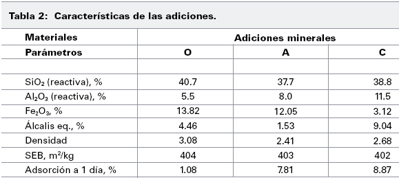 La diferencia en la composición mineralógica de los cementos portland, en parte se refleja en sus distintas densidades; en cuanto a sus finuras son comparables. La diferencia en el carácter químico de las puzolanas naturales se aprecia claramente por sus contenidos relativos de sílice reactiva y alúmina reactiva; además se incluye la adsorción de humedad de las puzolanas teniendo la O la menor adsorción, este parámetro cobra importancia en la demanda de agua para la pasta de consistencia normal (Tabla 3).