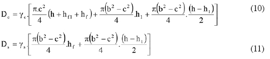 Para el cálculo del peso propio Dc de una base de sección circular y del suelo Ds (descontando el fuste hf1), pueden utilizarse (Ecs. 10 y 11), que surgen de deducir el volumen de la estructura según la figura 12.