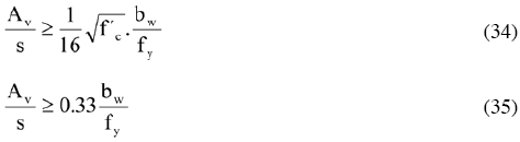 La cuantía mínima de estribos de corte resulta de las Ecuaciones 34 y 35.