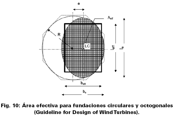 Las bases de aerogeneradores se encuentran sometidas a elevados momentos flectores, lo que origina diagramas triangulares de presiones, que desaprovechan la superficie de apoyo sobre el suelo. Según la Guideline for Design of Wind Turbines, es posible calcular la capacidad resistente del suelo de una fundación circular en función del área efectiva Aeƒƒ de forma elíptica, según la Ecuación 2.