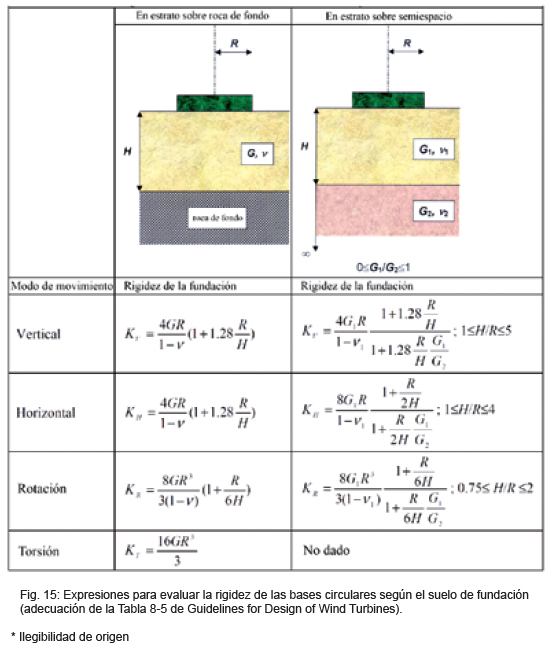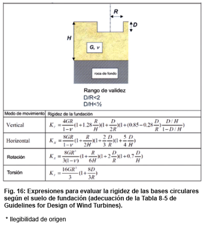 La rigidez total de la fundación depende de la resistencia y características del suelo, así como de los elementos que la componen. La mayoría de los proveedores de aerogeneradores eólicos plantean requisitos mínimos en este sentido para las bases de hormigón armado, y en especial, de la componente rotacional. Su importancia radica en la respuesta estructural dinámica ante la acción del viento y los sismos. En Guidelines for Design of Wind Turbines se incluyen expresiones para la determinación de la rigidez estática de las bases que dependen principalmente del módulo de corte dinámico G, el coeficiente de Poisson ν, el radio de la fundación R y la profundidad H del/los estrato/s analizado/s. El procedimiento responde a cálculos estáticos, aproximándose a frecuencias de vibraciones nulas. La rigidez dinámica se aparta de este análisis para altas frecuencias de vibración. Sin embargo, el cálculo estático es representativo para fundaciones de aerogeneradores sometidos a cargas generadas por el viento. En zonas sísmicas, se suelen efectuar reducciones de los resultados.