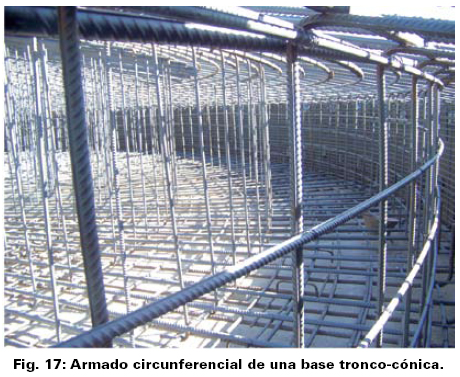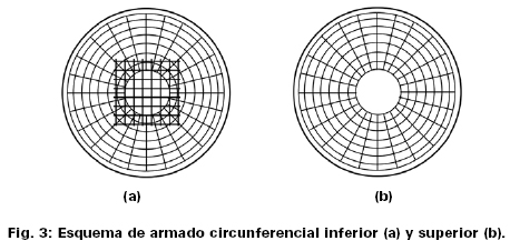 La geometría en planta de las bases aisladas resulta un aspecto importante al momento de definir el diseño de las mismas, presentándose distintas variantes. Las bases de sección tronco-cónica permiten absorber de manera más adecuada el cambio de dirección de los esfuerzos transmitidos por los aerogeneradores, pero presentan en contrapartida dificultades para el encofrado y colocación de las barras. Las armaduras se ubican usualmente en dirección radial y circunferencial (Fig. 3). Como alternativa, es posible efectuar un armado ortogonal para simplificar el trazado de las mismas (Fig. 4).
