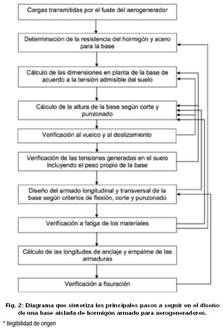 El presente trabajo expone algunos aspectos relevantes en el diseño y construcción de bases aisladas para aerogeneradores. Se indican criterios de diseño y tareas en la etapa constructiva. Se desarrolla un análisis de la geometría y su incidencia en las variables de diseño, evaluando presiones, armadura requerida, rigidez rotacional, fatiga de materiales, entre otras. Finalmente, se extraen conclusiones referidas a las gráficas obtenidas y tareas relacionadas con la construcción.