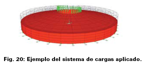 Adicionalmente, se efectuó la modelación de una base tronco-cónica, una octogonal y otra rectangular, a los efectos de comparar la distribución de tensiones en cada una. Para ello, se aplicaron las cargas transferidas por el aerogenerador seleccionado a un modelo de elementos finitos sólidos (Fig. 19), con las características del hormigón señaladas anteriormente. El momento flector se descompuso en un sistema de vectores considerando la incidencia del viento desde una dirección predominante (Fig. 20). El suelo ha sido modelado mediante un sistema de resortes areales con un coeficiente de balasto de 1 kg / cm3 y se ha impedido el desplazamiento horizontal de los nudos perimetrales. El fuste no se ha modelado considerando que el mismo posee una gran masa y se comporta de manera rígida.