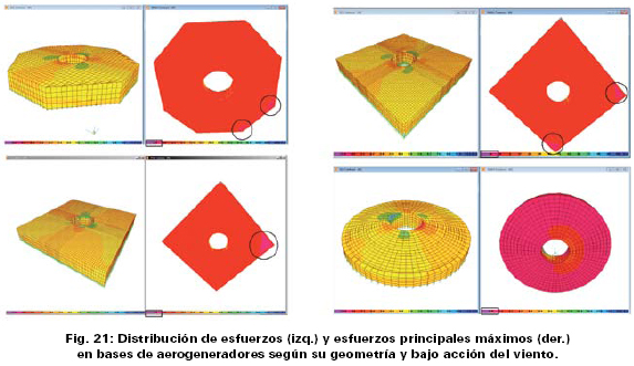• La geometría óptima de una base para aerogeneradores resulta la tronco-cónica de acuerdo a los cambios de dirección generados por los esfuerzos transmitidos por la superestructura. Las restantes geometrías producen concentración de tensiones de distinta magnitud en las esquinas que deben ser evaluadas y absorbidas por armaduras adicionales.