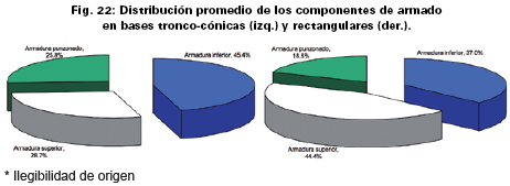 25 %. En las bases cuadradas, se incrementa la incidencia de la armadura superior cuanto mayor es el lado a causa del peso propio. Este valor puede llegar al 40 % de las armaduras totales. Las distribuciones expuestas permiten mejorar aspectos de diseño, economía y organización de la obra.• Las bases tronco-cónicas generan mayor dificultad en el doblado y armado de las barras de armadura, con valores superiores de horas/tonelada de acero trabajado a los obtenidos para las rectangulares (60 % del total). Para el encofrado, la relación se invierte, con un 40 % en las bases tronco-cónicas respecto del total de horas trabajadas por metro cuadrado de ambas bases.