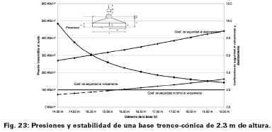 La presión transmitida al suelo de la base se reduce inicialmente con el incremento de la altura a causa del efecto favorable de la reducción de excentricidad que esto provoca. Sin embargo, el comportamiento se invierte a causa del aumento del momento flector que esta carga genera.