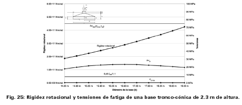 El criterio de rigidez rotacional de las bases analizadas verifica para la mayoría de los requerimientos de los proveedores de aerogeneradores, los cuales suelen imponer un valor del orden de 3 a 4.1010 N.m/rad. Esto es válido para un suelo con las características indicadas en el inciso 5.1, que reúne un conjunto de propiedades mínimas y razonables para estructuras de este porte.