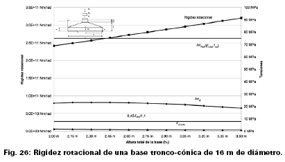 De la figura 23 a la figura 28, se puede observar que la base tronco-cónica óptima para el aerogenerador seleccionado corresponde a una con un diámetro b entre 16 y 16.50 m y una altura h entre 2.3 y 2.4 m. Esta combinación es la que mejor se comporta bajo condiciones últimas (Fig. 29), y verifica asimismo los estados límites de servicio.
