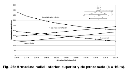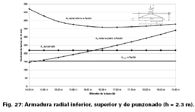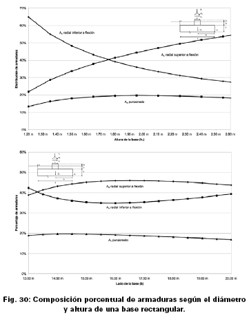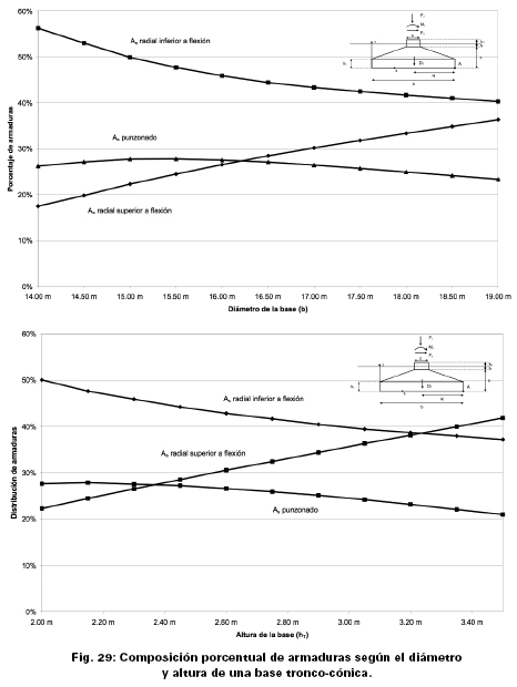 La armadura inferior es el principal componente de acero estructural de la base circular, con una proporción promedio del 45 %, mientras que la superior lo hace con el 30 % y la de punzonado con el 25 % (Fig. 22) y según surge de la intersección de las curvas (Fig. 28). Estas proporciones varían según las variantes efectuadas en las dimensiones de la estructura analizada.