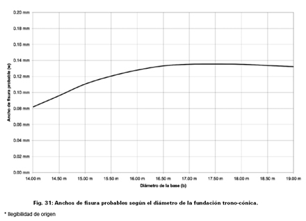 Siguiendo las recomendaciones del apartado 3.1.4, se procedió a analizar el ancho de fisura probable según los esfuerzos sobre las armaduras inferiores para un momento equivalente al del 60 % de las máximas cargas operativas del aerogenerador seleccionado. Los resultados se graficaron variando el diámetro de la fundación iterando los valores de los parámetros α, фb y γ.