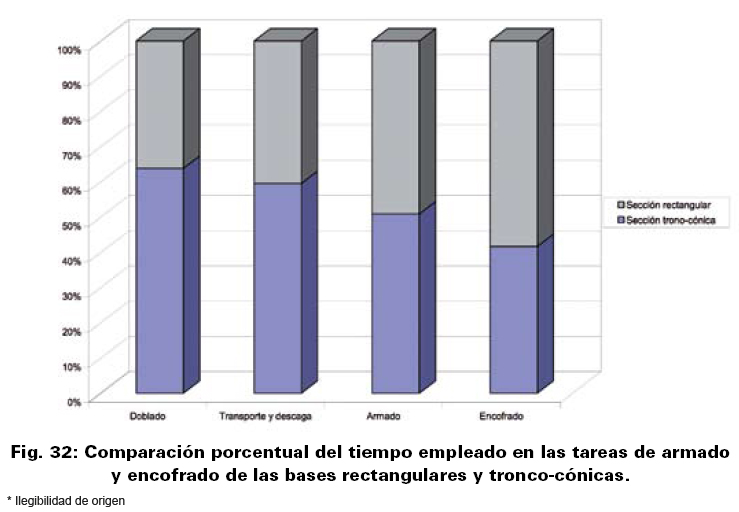 Como puede observarse en la figura 32, las bases tronco-cónicas generan mayor dificultad en el doblado y armado de las barras de armadura, con mayor porcentaje de horas trabajadas por tonelada de acero (cerca del 60 % respecto de la rectangular). Para el encofrado, la relación se invierte, con un 40 % del total de horas trabajadas por metro cuadrado de ambas bases.