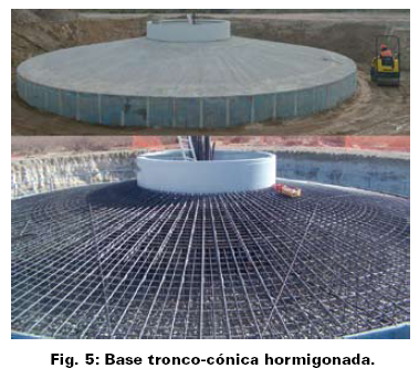 Para afectar lo menos posible el comportamiento estructural, generalmente el colado de este tipo de bases se realiza en una sola etapa. Puesto que se trata de grandes volúmenes de hormigón, es necesario llevar un estricto control de las temperaturas. Para el control de la temperatura del hormigón es recomendable colocar un mínimo de 2 termopares en la base, uno cercano a la superficie (alrededor de 0.2 m) y del borde lateral (en el orden de los 0.50 m); y el otro a 1.50 metros de la superficie y a aproximadamente 3 metros del lateral. Estos valores pueden requerir modificaciones según las dimensiones totales de la base. Los termopares deben ser fijados a la armadura vertical para evitar que los mismos sean desplazados o doblados durante el colado y la compactación del hormigón. El proceso de hormigonado debe desarrollarse de forma continua y en una sola operación hasta completar el volumen de la base. El hormigón puede ser colado en capas de 0.50 metros de espesor máximo. El inicio del vertido del hormigón de la primera capa debe comenzar en el centro de la base conformando un cono de descarga que se expanda hasta completar una altura de 0.50 metros. La altura de colado del hormigón no debe superar 1.50 metros de altura por gravedad. Durante la primera etapa debe buscarse que el hormigón vertido desde el centro penetre en primer lugar por debajo de las armaduras inferiores de la zona central de la base hasta recubrirlas completamente, asegurando de esta manera que no queden oquedades debajo del inserto metálico. Completada esta tarea se continúa con la tarea de hormigonado en forma circunferencial y con un sentido de avance radial desde el centro hacia los laterales. Una vez terminada esta primera etapa, se procede de igual manera con las etapas siguientes hasta el hormigonado total.