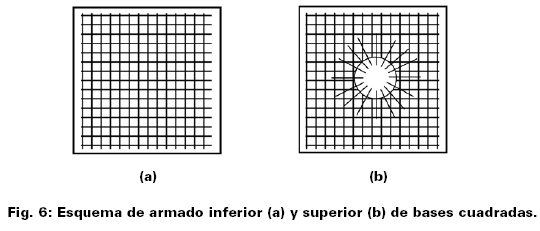 Las fundaciones de sección cuadrada son más sencillas de encofrar y tienen armaduras inferiores dispuestas en dos direcciones ortogonales. Para el caso de insertos metálicos, la armadura superior se coloca radialmente atravesando el mismo, mientras que el resto coincide en dirección con la inferior (Fig. 6).