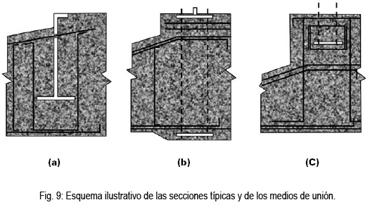 b) Adaptador de acero con pernos a presión: es un adaptador cilíndrico compuesto por una serie de pernos fijos a una brida inferior. En algunos casos la brida inferior se coloca por encima de la armadura y otras por debajo. Es común observar un incremento del espesor de la base en la zona central por debajo del adaptador (Fig. 9b).