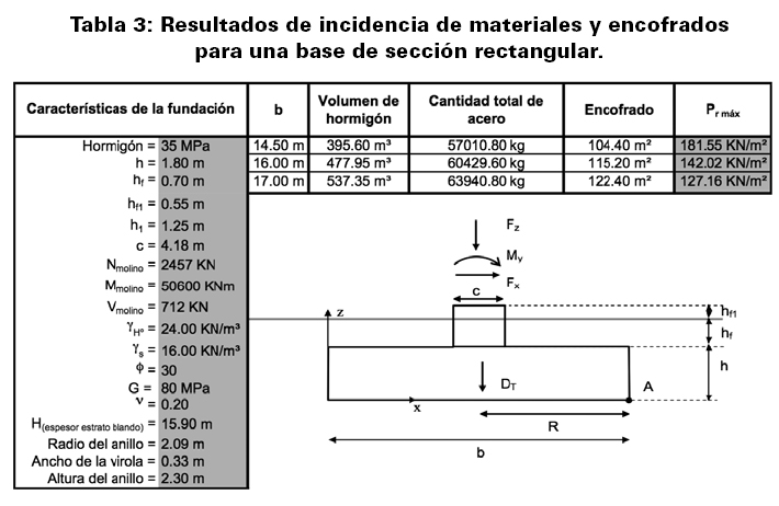 Los resultados obtenidos de la comparación de consumo de materiales para una fundación de sección rectangular y otra de sección tronco-cónica se exponen en la Tabla 2 y en la Tabla 3. Ambas corresponden a un mismo generador y a secciones equivalentes (similar presión transmitida al suelo). No se ha incluido en la fundación rectangular la armadura local adicional producto de la concentración de tensiones, lo que conlleva a incrementar las diferencias indicadas.
