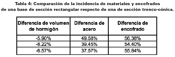 La Tabla 4 cuenta con un análisis de los resultados, con una leve diferencia en favor de las bases rectangulares en relación al hormigón requerido (del 5 al 10 %), mientras que existe menos consumo de acero y de encofrado en las bases tronco-cónicas, con diferencias que se aproximan al 50 %. Este hecho se traduce en una economía en favor de esta última alternativa.