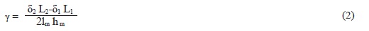 Las deformaciones por cortante del muro se pueden obtener a partir de los registros de los transductores de desplazamiento instalados en el sistema de varillas o tubos cilíndricos que considera dos medidores en la dirección de las diagonales y dos en los lados verticales. Con base en la teoría de la resistencia de materiales, la deformación unitaria angular, γ, es debida a los esfuerzos cortantes que actúan sobre un elemento determinado del modelo (Carrillo et al., 2012), y para el caso general de carga cíclica reversible se define mediante la siguiente expresión: