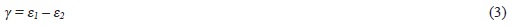En la expresión anterior se espera que las deformaciones ε1 y ε2 tengan signos opuestos. Si se usa esta expresión para el ensaye cíclico, de un muro, se suele tomar la expresión más directa: