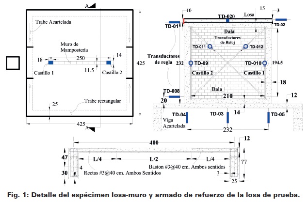 El espécimen consta de un muro sobre una losa cuadrada de 4.25 m x 4.25 m y espesor de 12 cm, colada monolíticamente con cuatro trabes de concreto reforzado de dimensiones 25 x 77 cm; las dos trabes transversales al muro son acarteladas y las dos paralelas a él son rectangulares. En el colado de losa y trabes se usó un concreto con resistencia f'c=250 kg/cm². El acero de refuerzo de la losa corresponde a un armado convencional tratando de representar lo observado en planos estructurales de edificios reales; el acero de refuerzo se distribuyó de forma uniforme, usando el mismo armado de acero en ambas direcciones. Se usaron varillas rectas en el lecho inferior en ambos sentidos de la losa a una separación de 40 cm, combinadas en la franja central con las varillas dobladas (columpios o bayonetas) también a una separación de 40 cm, quedando así una parrilla de 20 cm en ambos sentidos en la franja central. Además se colocan bastones o barras cortas en el lecho superior para resistir momento negativo, por lo que queda también una parrilla de 20 cm en las franjas laterales del tablero. La Figura 1 muestra el detalle del armado de la losa.