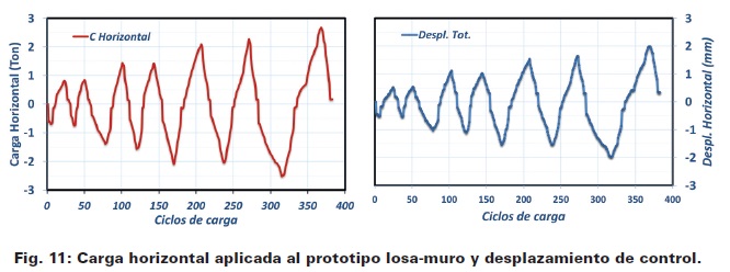 Como una segunda etapa del proyecto de prueba, el espécimen losa-muro se sometió a un proceso solo de carga horizontal cíclica monotónica. Este proceso consistió de siete ciclos de carga (empuje) y descarga (jale), que se controlaron por el desplazamiento horizontal en el extremo superior del muro, la carga se aplicó por un gato hidráulico de doble acción (que empuja y jala). En la Figura 11 se muestran esos ciclos, en secuencia de 0.5 mm, 1.0 mm y 1.5 mm, para el primer, segundo y tercer par respectivamente, y el último de 2.0 mm (llegando a cargas de 1.0 ton, 1.5 ton, y 2.0 ton, y el último ciclo a 2.5 ton).