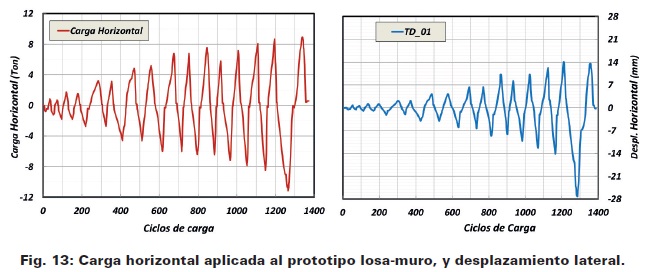 En la tercera etapa del proyecto de prueba, el espécimen losa-muro se sometió a un proceso simultáneo de carga vertical constante y una carga horizontal cíclica monotónica. Esta carga consistió de aplicar una carga vertical de 8.0 ton y después dieciséis ciclos de carga (empuje) y descarga (jale), que se controlaron por el desplazamiento horizontal en el extremo superior del muro, la carga horizontal se aplicó por un gato hidráulico de doble acción (que empuja y jala). En la Figura 13 se muestran los 16 ciclos, que como en los dos casos anteriores van en pares desde 0.5 mm hasta los penúltimos de 12 mm, y los dos últimos asimétricos de 14 mm y 27 mm, debido a la limitación del gato hidráulico en el caso de jale. En cuanto a carga se llegó a aplicar más de 11 ton en el empuje y 8.9 ton en jale.