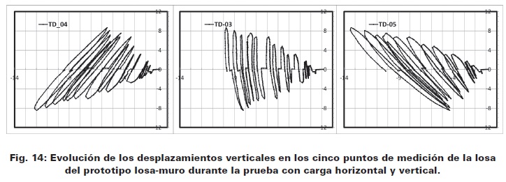 En la Figura 14 se muestra la evolución de los desplazamientos verticales en los tres puntos de medición vertical bajo la losa del prototipo durante la prueba con carga combinada. Estos son los medidores que registran los desplazamientos a largo de la línea central definida por los medidores TD05-TD03-TD04, que además es la línea del muro de mampostería. Debido a la aplicación de la carga horizontal, cuando el transductor derecho baja el izquierdo sube de la línea de referencia, lo que genera que el muro rote como cuerpo rígido, de acuerdo a la Figura 5. Se observa que los valores de desplazamiento se van incrementando desde el inicio de la carga, lo cual supone que debido a la intensidad de la carga vertical sobre la losa se comporta de una manera no-lineal. Para cada ciclo de carga la losa se deforma a una tasa de 0.5 mm sin regresar a su posición inicial, lo que representa un acumulado de aproximadamente 9.5 mm al final de la prueba.
