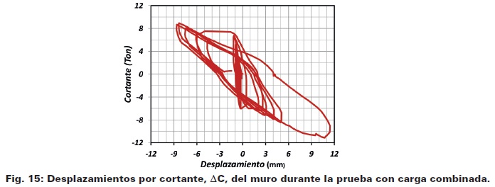 En el proceso de carga combinada, el muro no tuvo deformaciones por cortante en la primera parte del proceso de carga (primeros seis ciclos), y solo se desplazó por flexión y por la rotación en la base debido a la flexión de la losa. Pero a partir del séptimo ciclo comenzó la deformación por cortante (hasta el décimo ciclo se comporta de forma elástica, y después de este último se comporta de manera no-lineal).