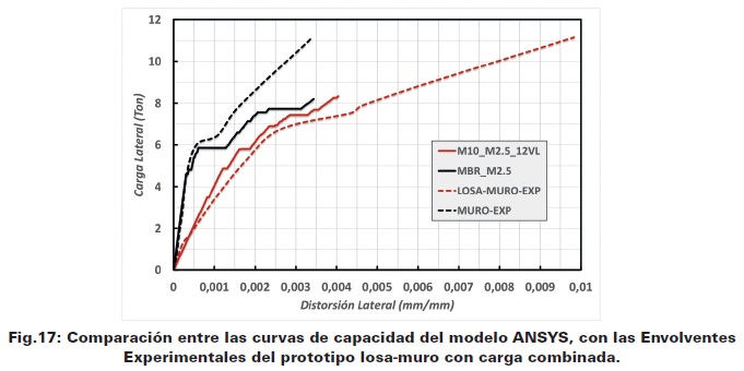 En la Figura 17 se comparan las curvas de capacidad obtenidas de los análisis con ANSYS, del modelo losa-muro M10_M2.5_12VL (muro sobre base flexible), con el modelo sobre base rígida o muro empotrado (MBR_M2.5). Se detectaron diferencias significativas en las curvas de capacidad; aunque en ambos casos la carga última tiende al mismo valor de 8 ton, es evidente que las pendientes son diferentes; es decir, en el modelo de muro sobre losa es menor y la rigidez es de 14 ton/cm, mientras que el muro con base fija la rigidez es de 40 ton/cm. Estos valores son muy parecidos a los obtenidos en el ensaye del espécimen losa-muro, como se puede constatar en la Figura 17, donde se comparan estas curvas experimentales con las numéricas.