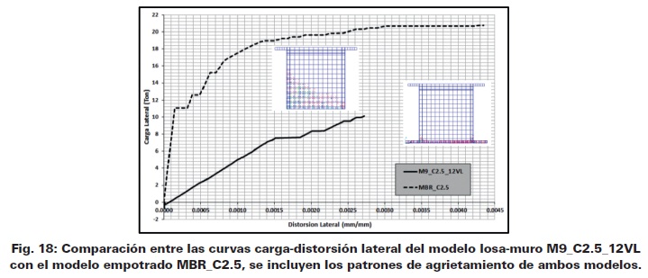 La distorsión efectiva del muro, Ref, se calcula con las Ecuación 5. La Figura 16 muestra las distorsiones totales Rtot, del sistema losa-muro y las efectivas durante todo el proceso de carga combinada. En esa misma Figura 16 se muestran las envolventes de esos ciclos de histéresis, se observa una tendencia bilineal en las curvas. Si se calculan las rigideces a partir de las pendientes de las envolventes, es decir, la rigidez del sistema losa-muro (negro) y del muro aislado (rojo); las rigideces son en cada caso 11.25 T/cm y 40.0 T/cm, es decir 3.5 veces menor cuando el muro está integrado a la losa.