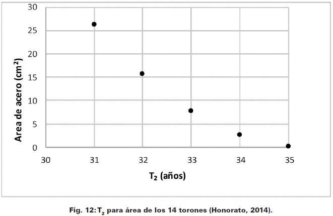 En la Fig. 11 se observa que, para un β = 3.5, que es el mínimo aceptable para el puente de acuerdo a estudios previos (Castillo, 2011), el área de acero de un torón es 0.247cm2 y la figura 12 muestra que, para un área de acero de los torones de T2 resulta ser de aproximadamente 33 años.