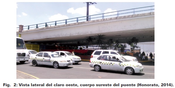 En la Figura 1 se muestra un corte por elevación y la planta del cuerpo en estudio (cuerpo sureste), mientras que en la fotografía que se presenta en la Figura 2 se puede apreciar una vista lateral del claro oeste del cuerpo sureste del puente vehicular.