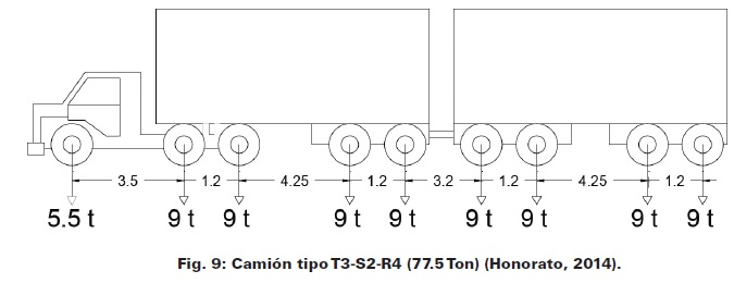 • Carga viva de diseño: Para el cálculo de la carga viva de diseño debida a los vehículos, se consideró en un carril un T3-S2-R4 (Fig. 9) y en los otros dos restantes dos HS-20.