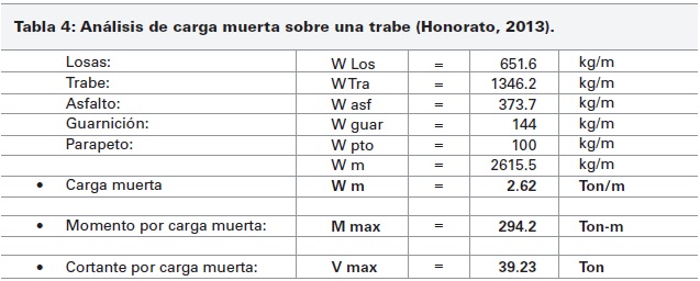 De acuerdo a las dimensiones de la superestructura, se obtienen las cargas para una sola trabe (Tabla 4).