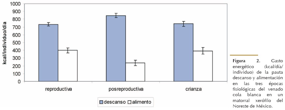 The energy expenditure of the white tailed deer in arid zones differs between sexes because males spent more energy (1726 ± 38 kcal/day/individual) than females (1556 ± 35 kcal/day/individual). We found significant differences between season-year interactions in the three activity patterns.