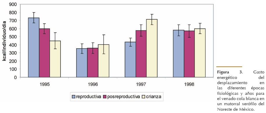 Para la actividad de desplazamiento o movimiento, los venados gastaron significativamente menos energía (Tabla 2) en 1996 en comparación con los otros tres años. Además se encontraron diferencias significativas en la interacción época por año, siendo durante la época de celo o reproductiva cuando ocurre un mayor gasto en comparación con las otras dos épocas en 1995, sin embargo, para 1996 se encontró que el gasto energético fue mayor en la época de crianza (Fig. 3).