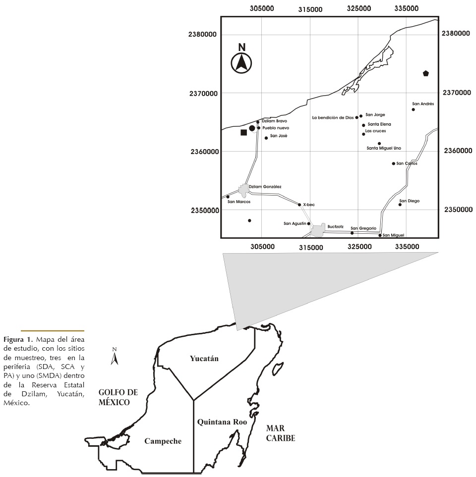 El estudio se realizó en Dzilam de Bravo, Yucatán donde se encuentra la Reserva de Dzilam, los sitios de muestreo estatal (Fig. 1). La vegetación del área II, III y IV se ubicaron fuera de ella y el I dentro del estudio corresponde en general a una selva baja caducifolia espinosa (SBCE) que contiene 386 especies vegetales, incluidas en 295 géneros y 96 familias botánicas. Las familias más representativas son: Fabaceae, Poaceae, Euphorbiaceae, Asteraceae y Cyperaceae (Flores y Espejel 1994; Gobierno del Estado de Yucatán 2006; Ortíz-Díaz et al. 2008). Para la selva baja caducifolia presente en los sitios y en un área de 1000 m2, Escárraga-Paredes (2009) registró 195 géneros y 124 especies vegetales. Entre las especies dominantes se encuentran: Cnidoscolus aconitifolius, Plumeria rubra, Acanthocereus pentagonus, Bursera simaruba, Aphelandra deppeana, Anthurium schlechtendalii, Neea psychotrioides, Aechmea bracteata, Metopium browneii, Opuntia stricta, Beucarnea pliabilis, Psidium sartotianum var. yucatanense, Jatropha gaumeri, Commelina erecta, Gymnopodium floribundum, Selenicereus donkelaarii y Talisia olivaeformis, siendo la familia más diversa la Fabaceae (Leirana-Alcocer et al. 2009).